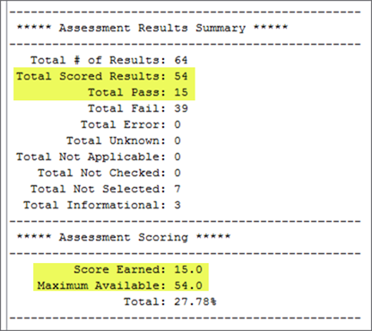 The results will include a few more entries than results displayed on the HTML report. The result terminology presented on the console is inline with xccdf specifications.
